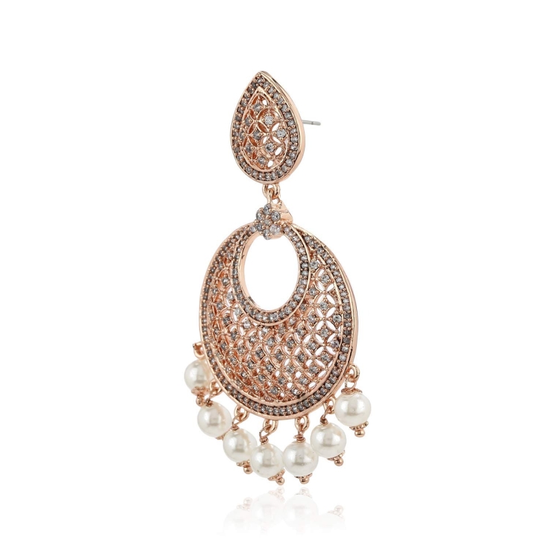 • Material: Alloy; Color: Rose Gold; Occasion: Western; Stone Type: Cubic Zirconia; Stone Color: White; Dimensions: 6.6 CM X 3.2 CM X 0.2 CM; Item Weight: 18.4 Gm; Pack contains: 1 Pair of Earrings