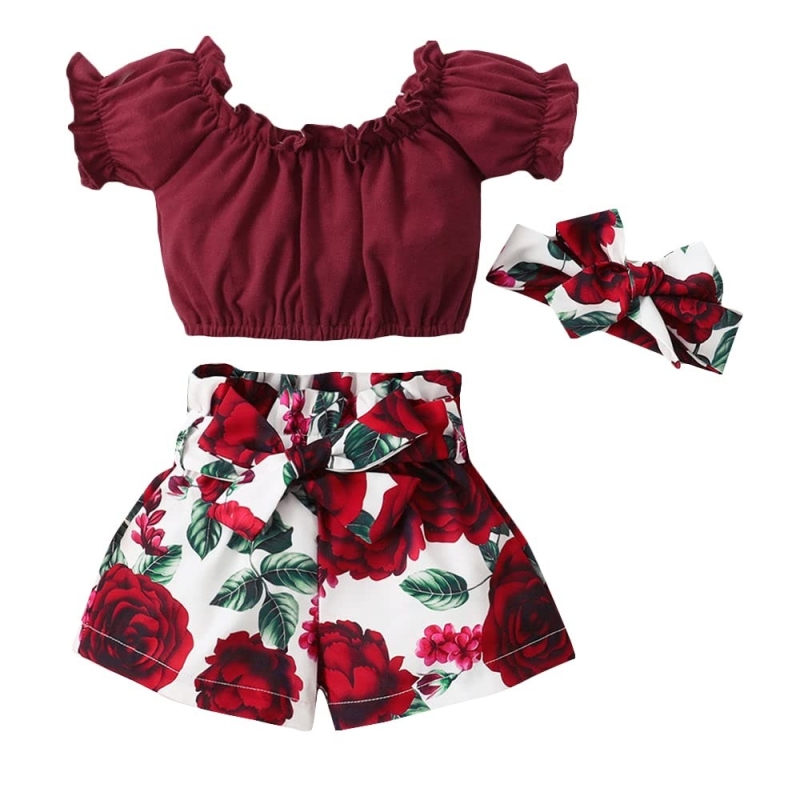 بلوزة بنات الحجلة ومجموعة قصيرة بطبعة الأزهار مع عقال من القطن والبوليستر باللون الأحمر