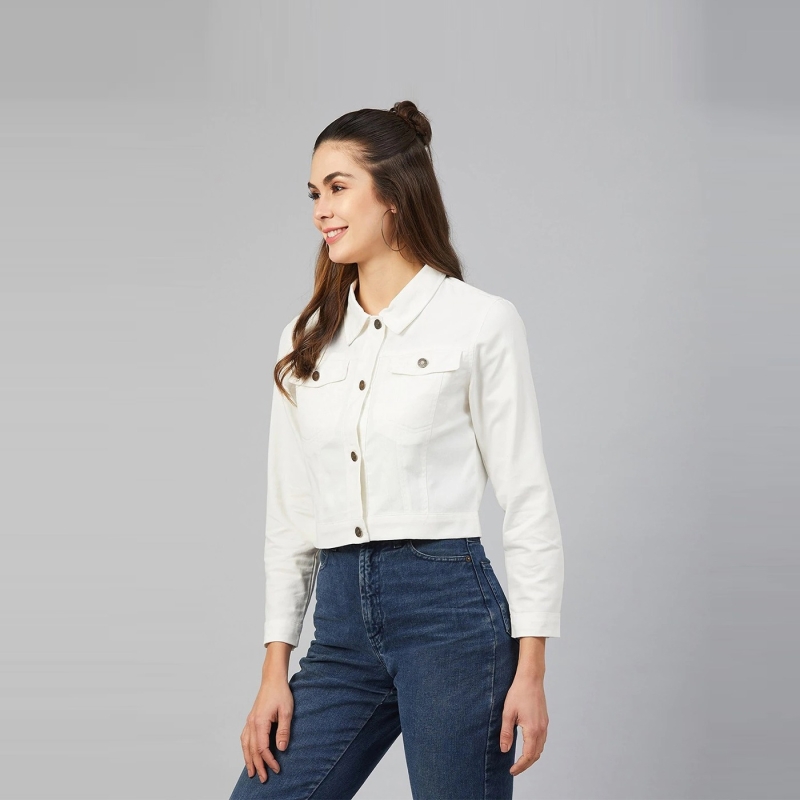 سترة بيضاء صلبة، بياقة عريضة، 2 جيب، زر للإغلاق، أكمام طويلة، حافة مستقيمة، وقطن