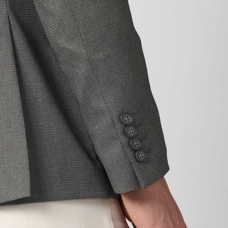 Grey self design slim fit formal blazer, has a notched lapel collar, long sleeves with buttons, single breasted with button closures,2 mock pockets with flaps ,1 pocket on chest and 2 internal pockets, attached lining, double vented back hem.